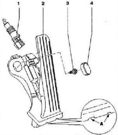 - 2 - Узел педали газа. Датчик положения педали акселератора «G79» и датчик положения педали акселератора 2 «G1B5», не регулируется. Датчик положения педали акселератора передает блоку управления двигателя данные о желаемой мощности двигателя. «А»: отверстия для съемника