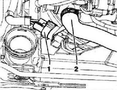 Снять защиту картера. Освободить пружинный хомут и снять шланг системы охлаждения «2». Позицию «1» не принимать во внимание.