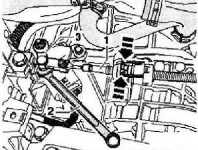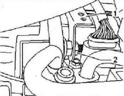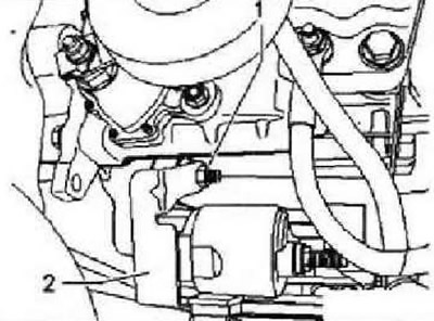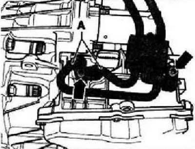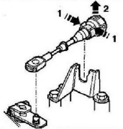 Действуйте обдуманно, чтобы не деформировать трос. Не использовать клещи -фиксаторы на контропоре могут сломаться. Затем отжать трос с шаровой головки «2». Разъединитъ все доступные сверху электрические соединения к коробке передач и стартеру: многофункциональный переключатель, стартер, провод массы на консоли.