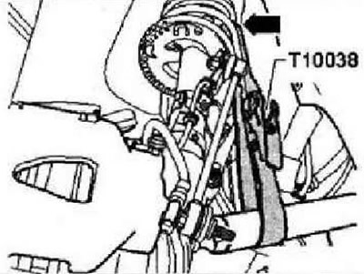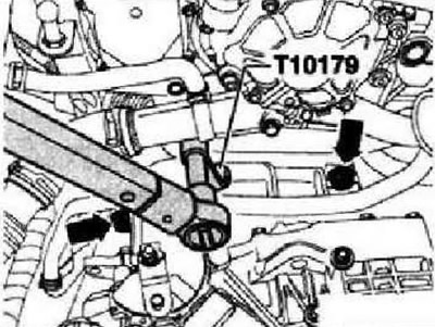 Соединить монтажный захват коробки передач «3282» с установочным шаблоном 3282/56-. Подвести кантователь-V.A.G 1383 А- под коробку передач и подпереть ее. Не поднимать. В этом положении коробка передач отсоединяется от двигателя. Открутить последний соединительный болт двигателя/КП. Осторожно опустить КП, обращая внимание на расстояние до окружающих деталей. При опускании коробки передач внимательно следить за магистралью ATF.