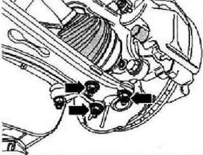 С обеих сторон открутить -гайки- нижнего рычага подвески. Отжать оба приводных вала от коробки передач. Снять левый приводной вал.