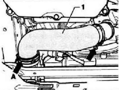 Снять шланг наддува «1». Разъединить снизу два доступных электрических соединения КП.