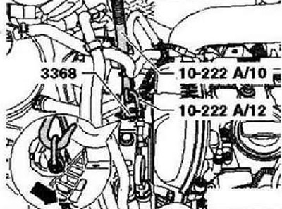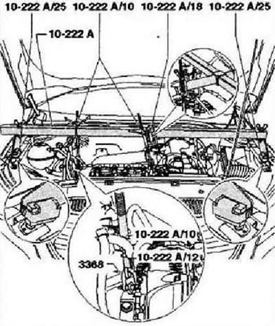 Открутить все хорошо доступные соединительные болты между двигателем и КП. Опустить автомобиль. Установить траверсу -10 - 222 А-. Для того чтобы при выкручивании и затяжке опоры коробки передач не происходили перекосы / деформации, установить крюки -10 - 222 А/10- слева и справа так, как показано на рисунке.