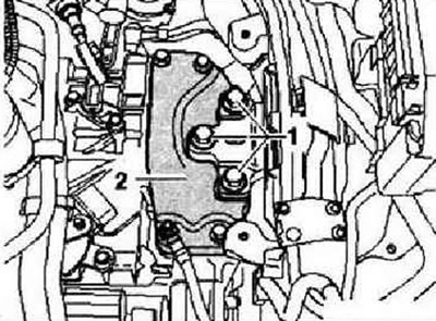 Открутить болты «1» крепления опоры КП к консоли. Открутить крепление консоли «2» от КП. Опустить двигатель/коробку передач с помощью левого ходового винта примерно на 6 оборотов. Вынуть консоль.