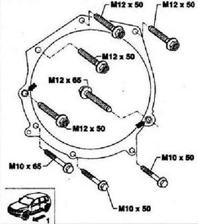 1 - Направление движения. Ведомый диск к гидротрансформатору, 60 Нм, 6 штук, устанавливать и снимать с помощью насадки -V/175-. М12-болты - М12, 80 Нм, М10-болты - М10, 40 Нм, эти болты расположены во фланце снизу. Две установочных втулки в двигателе «стрелки».