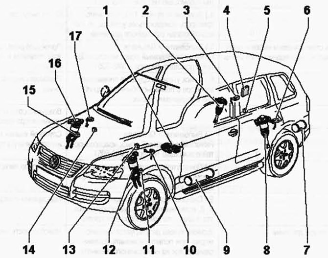 1 - компрессор с блоком магнитных клапанов; 2 - правый задний упругий пневматический элемент; 3 - задний правый датчик уровня кузова; 4 - блок управления системы регулирования клиренса; 5 - задний датчик ускорения кузова; 6 - задний левый датчик уровня кузова; 7 - пневмоаккумулятор задний; 8 - упругий пневматический элемент задний левый; 9 - пневмоаккумулятор передний; 10 - передний левый датчик уровня кузова; 11 - датчик ускорения колеса передний левый; 12 - упругий пневматический элемент передний левый; 13 - датчик ускорения кузова передний левый; 14 - датчик ускорения кузова передний правый; 15 - датчик ускорения колеса передний правый; 16 - упругий пневматический элемент передний правый; 17 - передний правый датчик уровня кузова.
