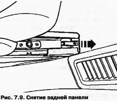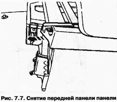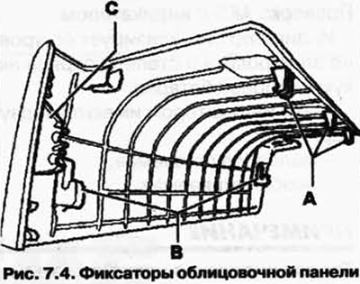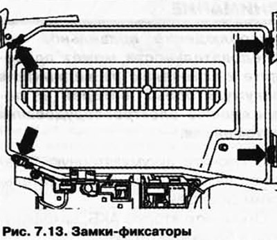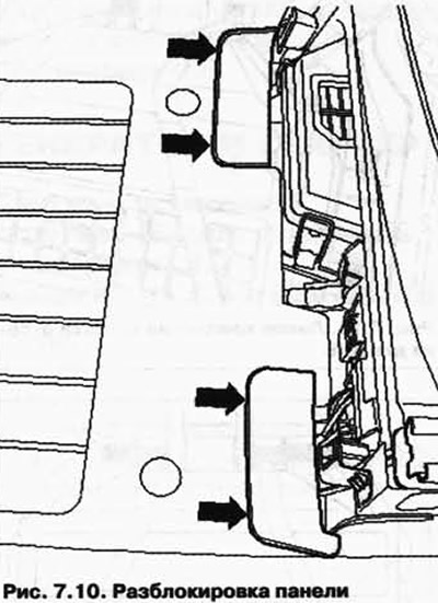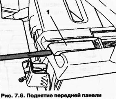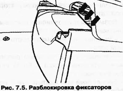 Разблокируйте фиксаторы нажатием вниз и назад одновременно. В таком положении приподнимите облицовочную панель в области фиксаторов (рис. 7.5).