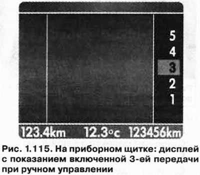Если переключение передачи было осуществлено ручным управлением «Tiptronic», то на дисплее только показание этой передачи (рис. 1.115).