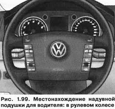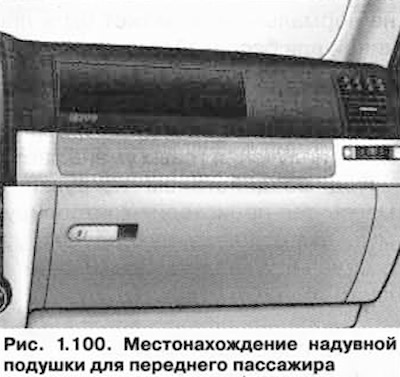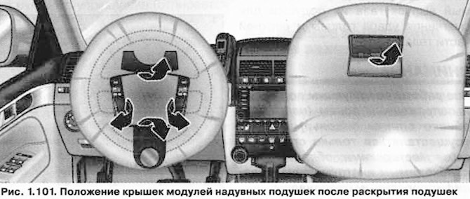 Крышки модулей надувных подушек при развертывании подушек раскрываются (рис. 1.101). При этом крышки остаются закрепленными к рулевому колесу и к передней панели.