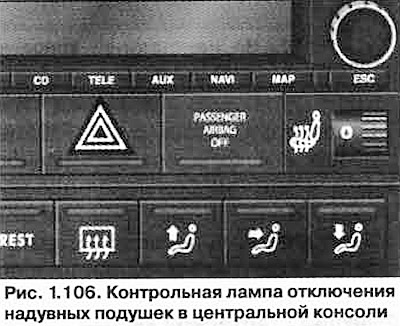 Убедитесь, что при включенном зажигании контрольная лампа «PASSENGER AIRBAG OFF» в центральной консоли (рис. 1.106) постоянно горит.