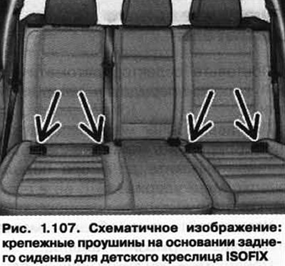 По две проушины «ISOFIX» находятся у крайних задних сидений и у правого переднего сиденья. Проушины «ISOFIX» прикреплены к кузову. Они находятся между спинкой и подушкой сидений (рис. 1.107).