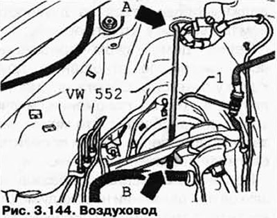 Если на автомобили установлены пневматические амортизаторы, необходимо отсоедините воздуховод 1 и выпустить воздух (рис. 3.144).