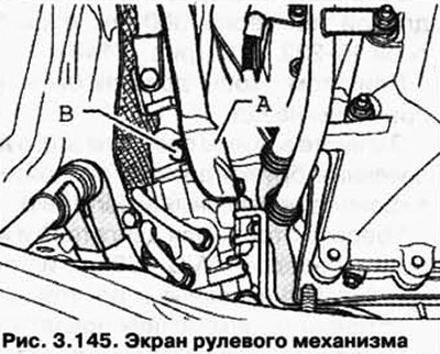 При наличии - снимите экран А с рулевого механизма (2 болта) (рис. 3.145).