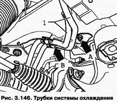 Если необходимо - снимите трубки системы охлаждения 1 с левого лонжерона. Для этого окрутить гайку и держатель (рис. 3.146).