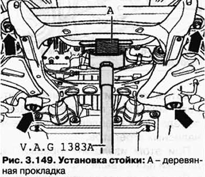 Установите стойку для двигателя и коробки передач V.A.G 1383 А под кронштейн двигателя и слегка прижмите (рис. 3.149).