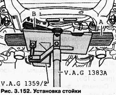 Поставьте стойку для двигателя и коробки передач V.A.G 1383A с универсальным упором для коробки передач 1359/2 под кронштейн навесных агрегатов и слегка прижмите (рис. 3.152).