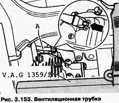 Осторожно снимите вентиляционную трубку А с ниппелем с передней главной передачи (рис. 3.153).