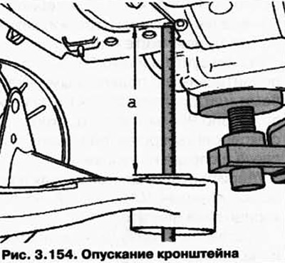 Осторожно опустите кронштейн навесных агрегатов с передней главной передачей на величину А (примерно 200 мм) (рис. 3.154).