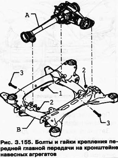 Снимите соединительные болты с гайками 1-3 передней главной передачи А на кронштейне навесных агрегатов В (рис. 3.155).