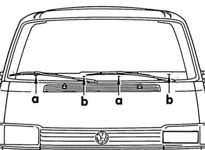 10. Установить рычаги дворников на оси так, чтобы дворники заняли положение, отмеченное на лобовом стекле маркировками. Затянуть рычаги моментом 10 Н·м. (а – маркировка для автомобиля с левосторонним управлением, b – маркировка для автомобиля с правосторонним управлением (экспортные модели)).