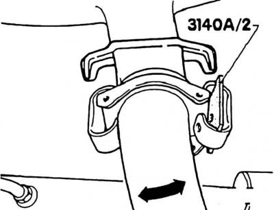 7. Отжать выхлопную трубу в сторону, так чтобы противоположная пружинная пластина растянулась. В этом положении вставить до упора короткий клин VW-3140 А/2 или HAZET 2586 N-2. Также растянуть вторую пружинную пластину и вставить клин.