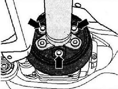 Відкрутити кріплення пружної муфти від головної передачі. Укласти ганчірку на поперечину тунелю. Зняти карданний вал разом із пружною муфтою і укласти його на поперечину тунелю.