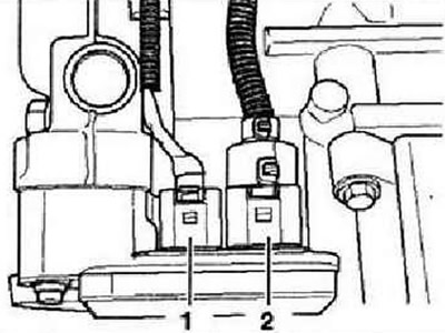 Викрутити болти "1" та "2" нижньої опори силового агрегату.